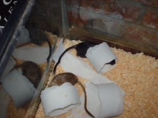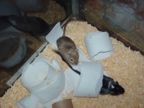 Gouda and Gruyere are my nine month old gerbils. The brown one is Gouda and the black and white one is Gruyere. Hemingway adores them and will sit and watch them run in their wheel for hours. He is the only one of the cats that never tries to get them for a snack.
